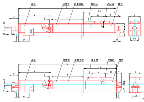 由于設計的螺旋輸送機的長度為12米。為了制造,安裝以及運輸的方便,其槽體和螺旋軸均采取分節制造,頭節長2.5米,接著是2.5米、2米、2.5米長的中間節,尾節長2.5米,靠螺栓聯接,并用中間軸承支承。同時,為了_分節裝配后輸送機的整體剛度,槽體的連接處和螺旋軸的連接處需分開一段距離。由于物料在螺旋輸送機
